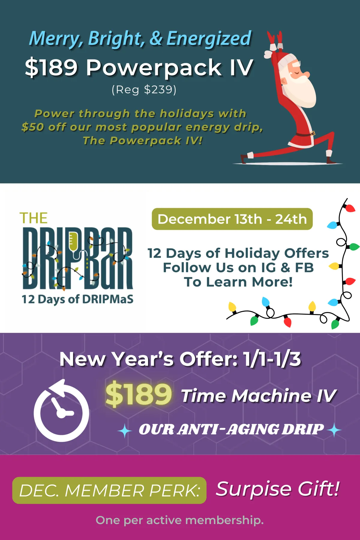 We have several top selling drips which include the Soother for relaxation, the Shield for immune support, the Powerpack for increased energy, and the NAD+ for anti-aging.